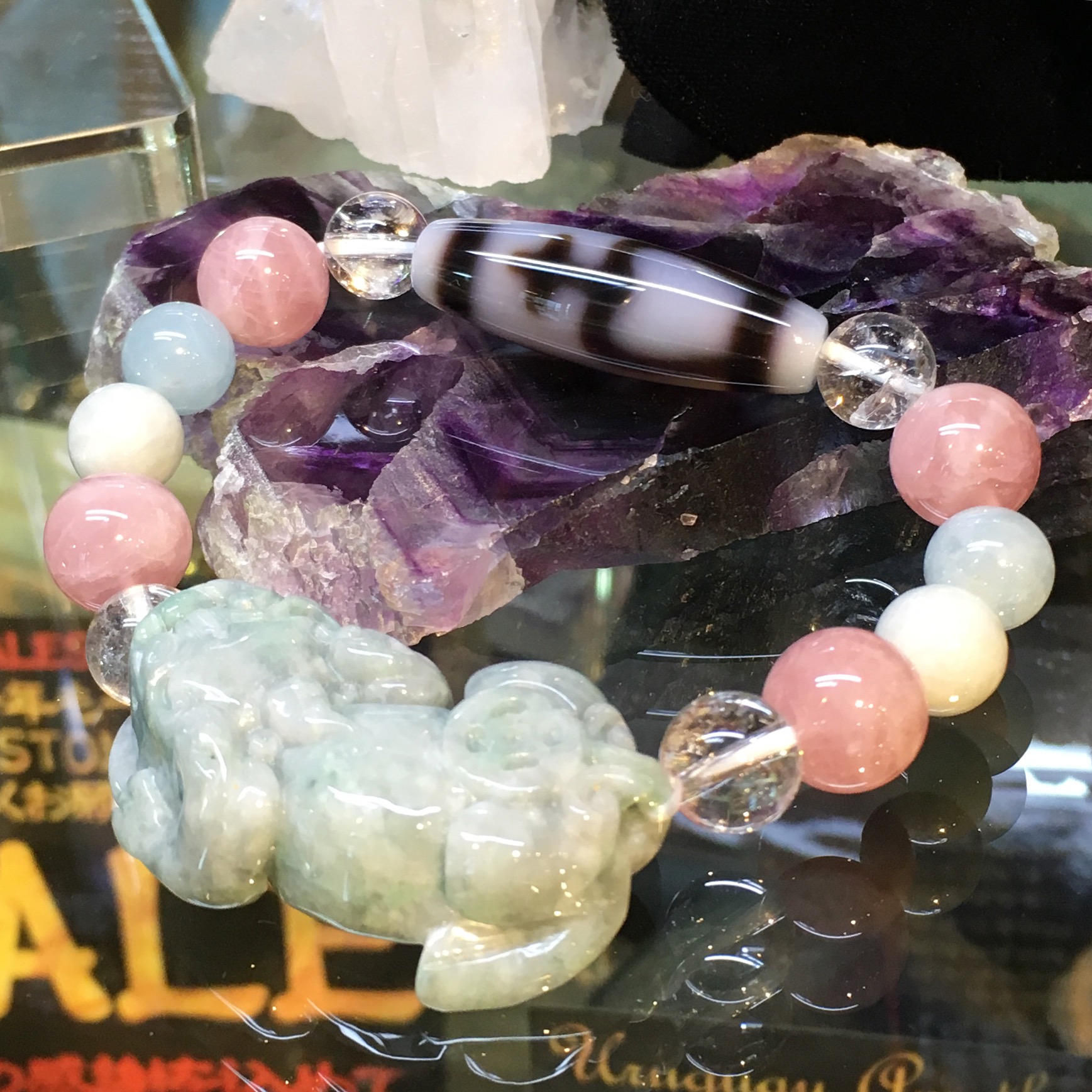 翡翠貔貅&白宝瓶天珠 女性の成功と金運を引き寄せる パワーストーンブレスレット☆ 愛とお金と地位・名誉 根こそぎGETの強欲ブレス!! 成長と進化の貔貅。 得たものを逃さず貯め置く宝瓶‼ 欲しがりますねぇ〜〜♪