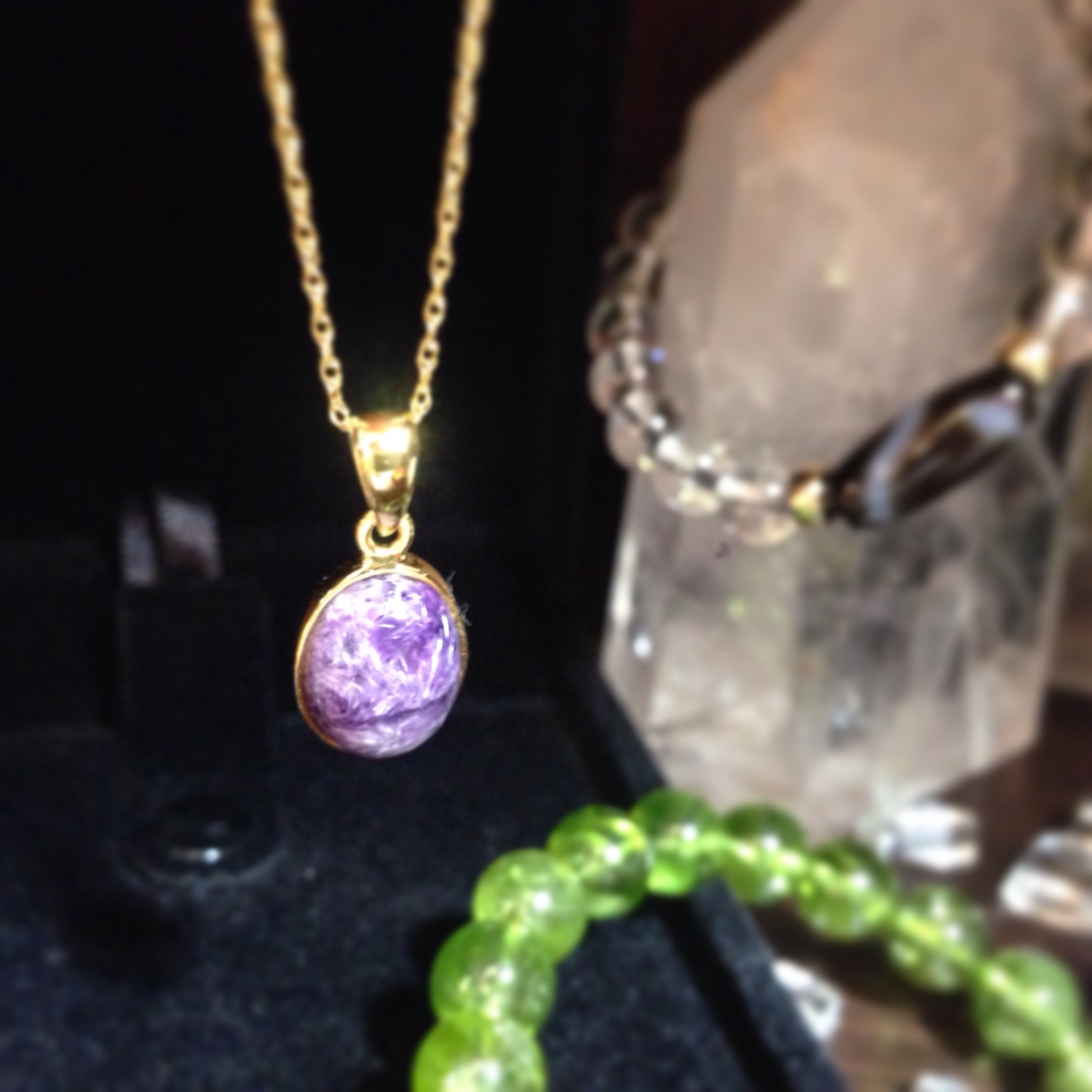 チャロアイトのペンダントです。 なーんか最近チャロアイト推しなんですよね! 僕。 自分が癒されたいのかな〜、癒しの石だし。 腕も首も、石まみれ☆ いいじゃないっ!最高ですよ。 これは。ちなみGF(ゴールドフィルド) 金属アレルギーもホント出づらくて、ゴールドの 輝きも長持ち、なかなか優秀なやつです。 できれば長く大事に使いたいですもんね☆